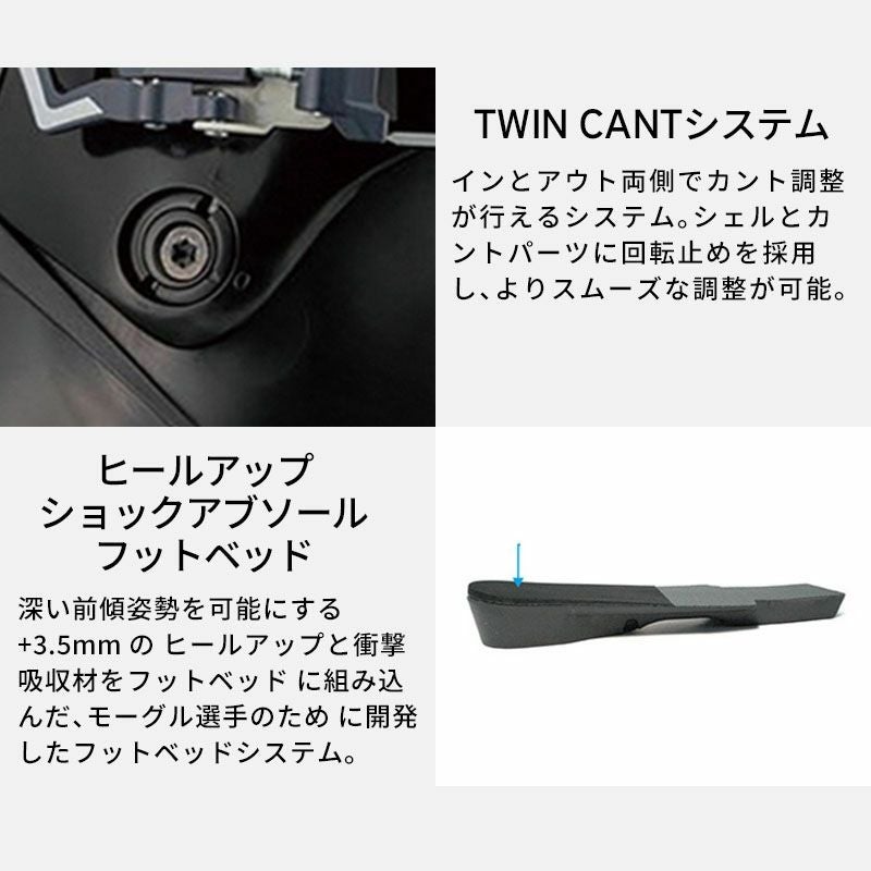 R-EVO 90Sをベースとし、堀島行真選手との共同開発から誕生したモーグル選手用モデル。フォールラインを外さずにスキー先端を常に先落としするための深い前傾ポジションと、足首の自由な曲げ伸ばしのためのV-SLIT、ヒールアップ・ショックアブソール、アクティブリアプレート、フリーフレックスを採用。