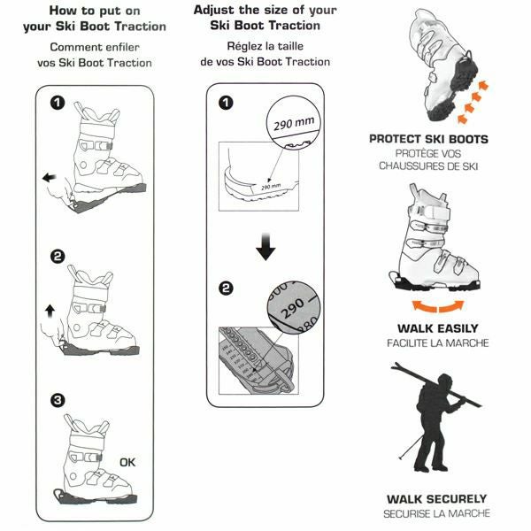 ブーツのつま先側から始めて、スキーブーツのトラクションにストラップに指をかけ、 後ろに引いてかかとで調整します。