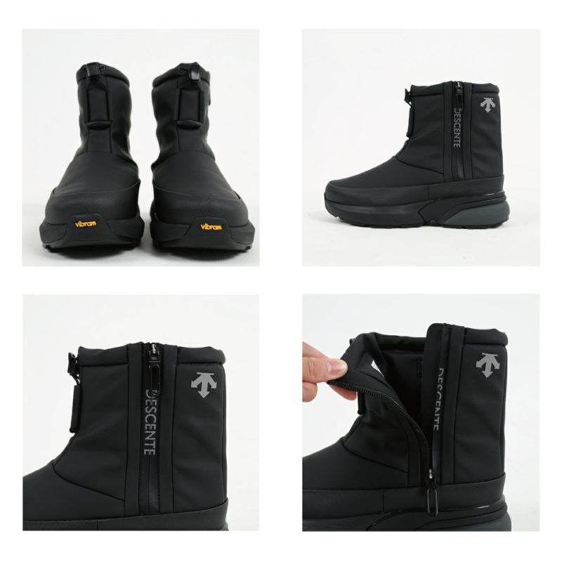 防滑性を高めるため、イタリアのヴィブラム社と協業し、オリジナルのアウトソールを作製。乾いた路面、濡れた路面を問わず、グリップ力を発揮し、耐久性も高い「ヴィブラム メガグリップ」と靴底の凹凸部分であるラグには、しっかり踏みしめる力を高める「ヴィブラム トラクションラグ」を採用。雪や雨などのシーンでの使用を想定した防水設計。また、防寒性を高めるため、デサントの独自機能であるヒートナビをライニングに搭載し、インソール表面にも蓄熱素材のベルセラを搭載。アッパー材はデサントがオリジナルで開発をした、マイクロファイバーベースの人工皮革を採用し、足馴染みと耐久性を考慮。