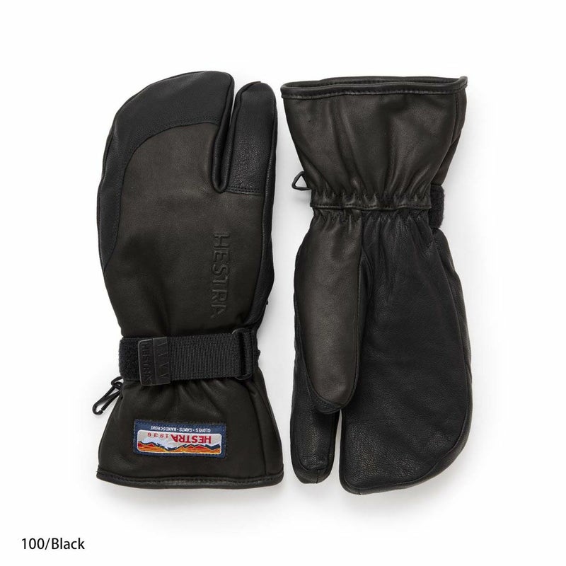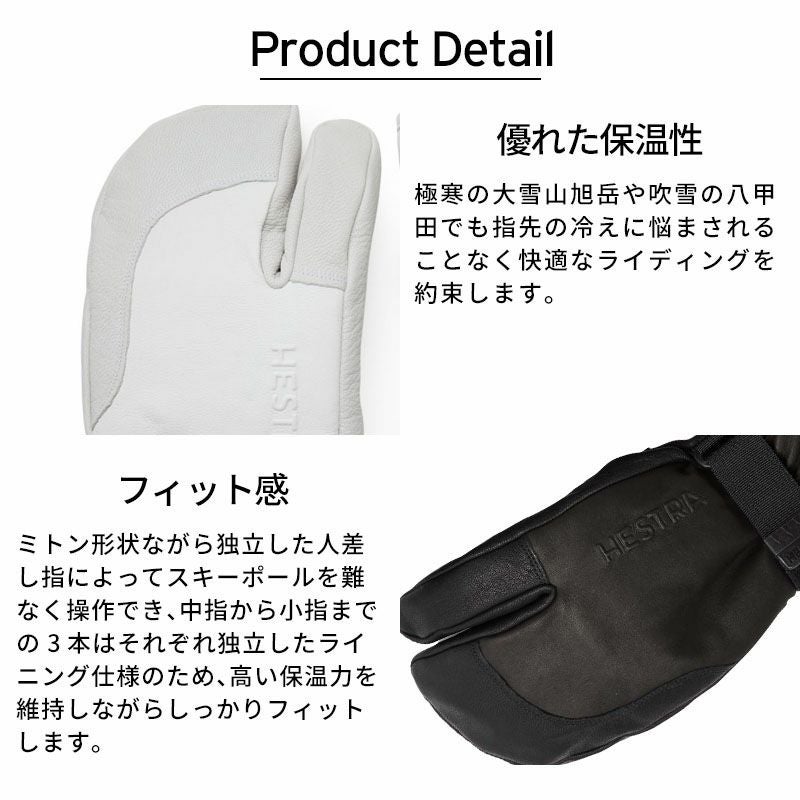 5本指グローブの操作感とミトンの保温力を兼ね備えた3フィンガーモデルは、厳冬期の雪山ライドになくてはならない存在。極寒の大雪山旭岳や吹雪の八甲田でも指先の冷えに悩まされることなく快適なライディングを約束します。ミトン形状ながら独立した人差し指によってスキーポールを難なく操作でき、中指から小指までの3本はそれぞれ独立したライニング仕様のため、高い保温力を維持しながらしっかりフィットします。HESTRAのフルレザー3フィンガーには使い勝手に応じて3タイプがあり、この「フルレザー」は安心感の高いレギュラーカフモデル。ウエアの袖口ごと包み込むように装着し、ベルクロ留めのコンプレッションを締めれば、雪や冷気の侵入を完全にシャットアウトします。素材は外側はやわらかな牛皮革、手のひら側はカラーによって強度の高いゴート(山羊)皮革と、しなやかな牛皮革があります。ポリエステルライナーは取り外しが可能です。