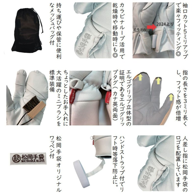 高級感あふれる牛革、やぎ革ミックス仕様。握りやすく疲れにくいエルゴグリップ立体型採用。3フィンガーで、操作性と保湿性を両立。ストック保持部はアテ革で補強。グローブ内をドライにと持つオリジナル透湿防水フィルムを内蔵し、軽くて温かい高機能中綿とペットボトルを再利用したリサイクルポリエステルを使用。甲袖口はエラスティックバンドで調節可能。人差し指にカラビナループ装着。ハンドストラップ、メッシュバック、お手入れに便利なミニブラシ、松岡手袋オリジナルワッペン標準装備。