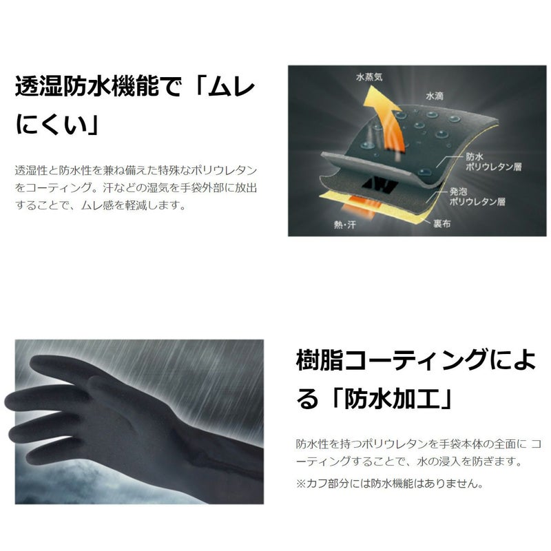 ・透湿性と防水性を兼ね備えたポリウレタンをコーティングし、汗などの湿気を手袋外部に放出することでムレを軽減。