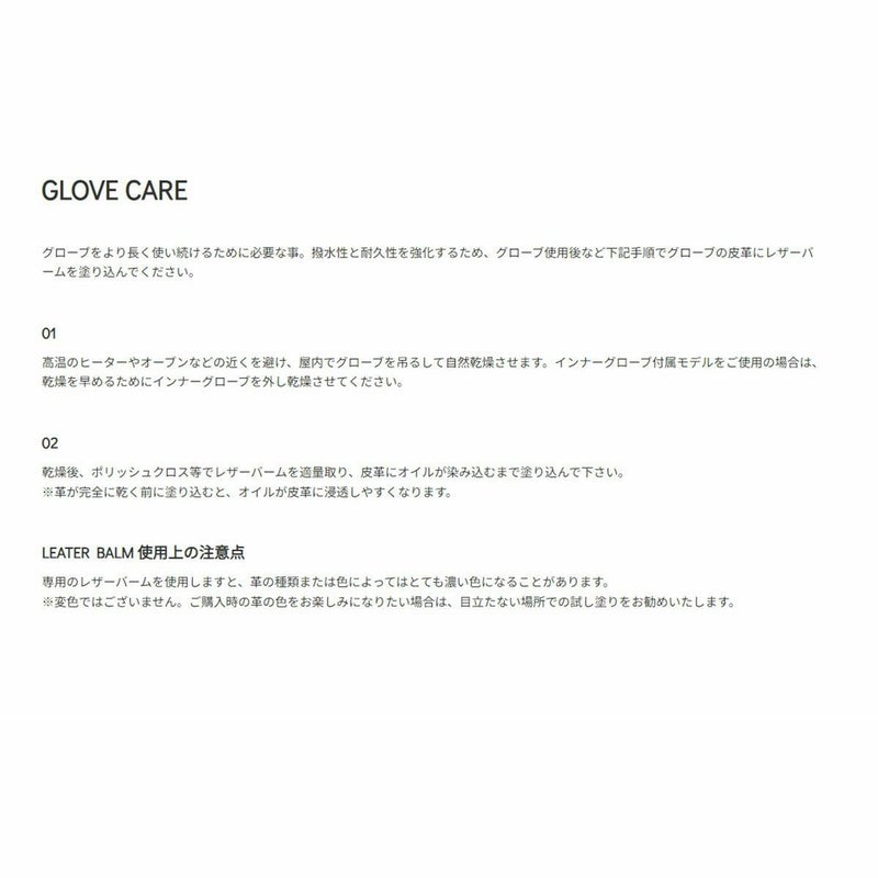 撥水性と耐久性を強化するため、グローブ使用後に皮革にレザーバームを塗り込んでください。