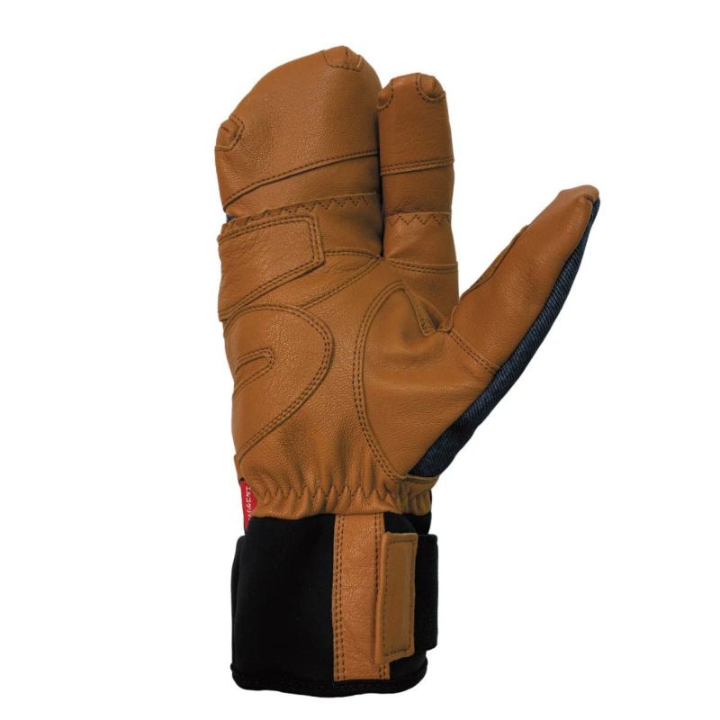 高級感あふれる国内なめしの牛革デニム柄型押し(セトウチレザー)、やぎ革仕様。握りやすく疲れにくいエルゴグリップ立体型採用。3 フィンガー で、操作性と保温性を両立。ストック保持部はアテ革で補強。グローブ内をドライに保つオリジナル透湿防水フィルムを内蔵し、軽くて暖かい高機能中綿を使用。甲部分に設置の隠しポケットに小さなクロス入り。袖口はエラスティックバンドで調節可能。人差し指にカラビナループ装着。ハンドストラップ、メッシュバック、お手入れに便利なミニブラシ標準装備。