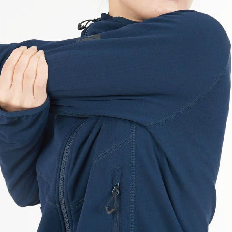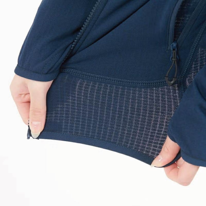 肌面では水を含まないポリプロピレン素材のグリッド構造によってドライを保ちつつ、表面には速乾性に優れたポリエステル素材を組み合わせたハイブリッド構造のジャケットです。肌面と衣服が立体的に触れ合うことで、断熱効果や通気効果も期待できます。運動量の多いアクティビティでのベースレイヤーとしてや、少し肌寒くなった時に羽織るフリースジャケットとしてなど幅広く活躍してくれます。