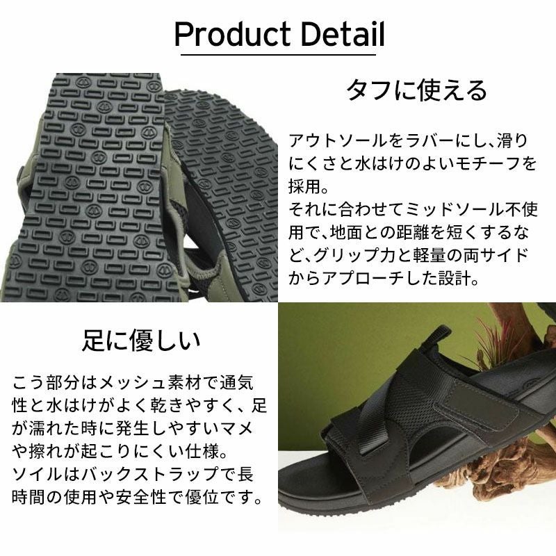 足に直にあたるソールは肌触りが良く、その下を支えるクッションソールは 衝撃吸収と耐久性に優れ、アウトソールはグリップ力が自慢です。