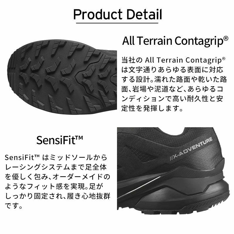 グリップと快適さ、安定性、防水性、そして果敢な精神が一つになった X-ADVENTURE GORE-TEX は、足場の不安定なトレイルでこそ本領を発揮します。あなたの冒険心を解き放って、家の近くから未知の領域まで、とにかく外に出かけて探検を始めてみましょう。