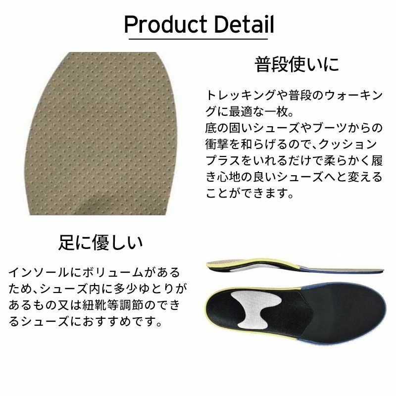 底の固いシューズやブーツからの衝撃を和らげるので、クッションプラスをいれるだけで柔らかく履き心地の良いシューズへと変えることができます。