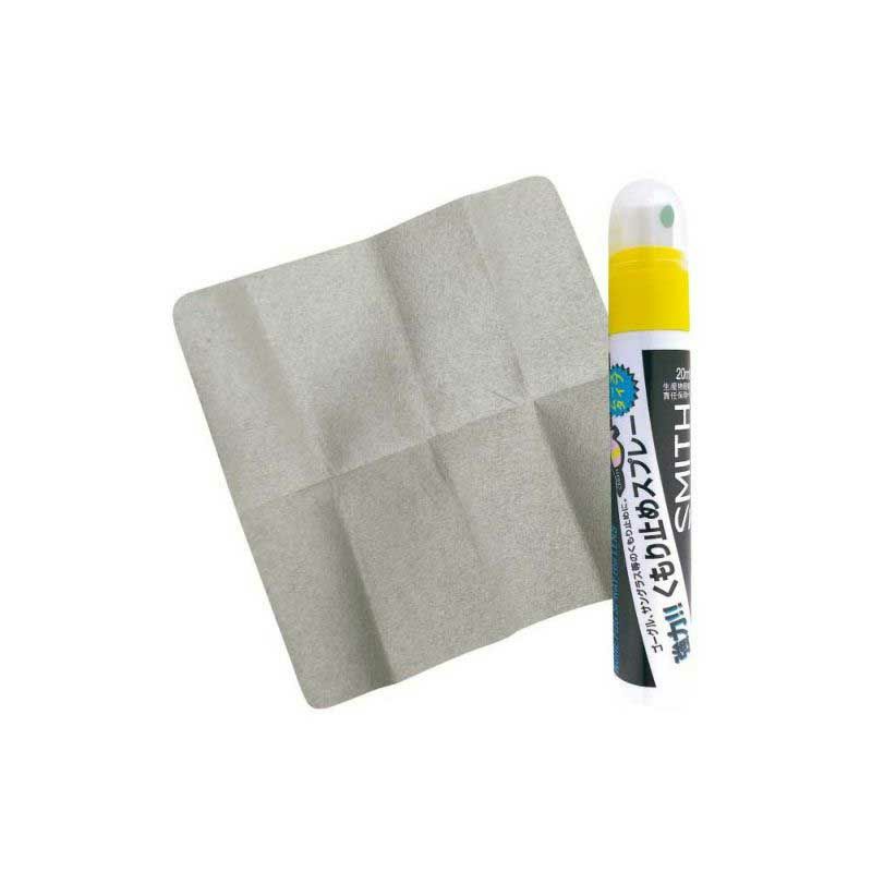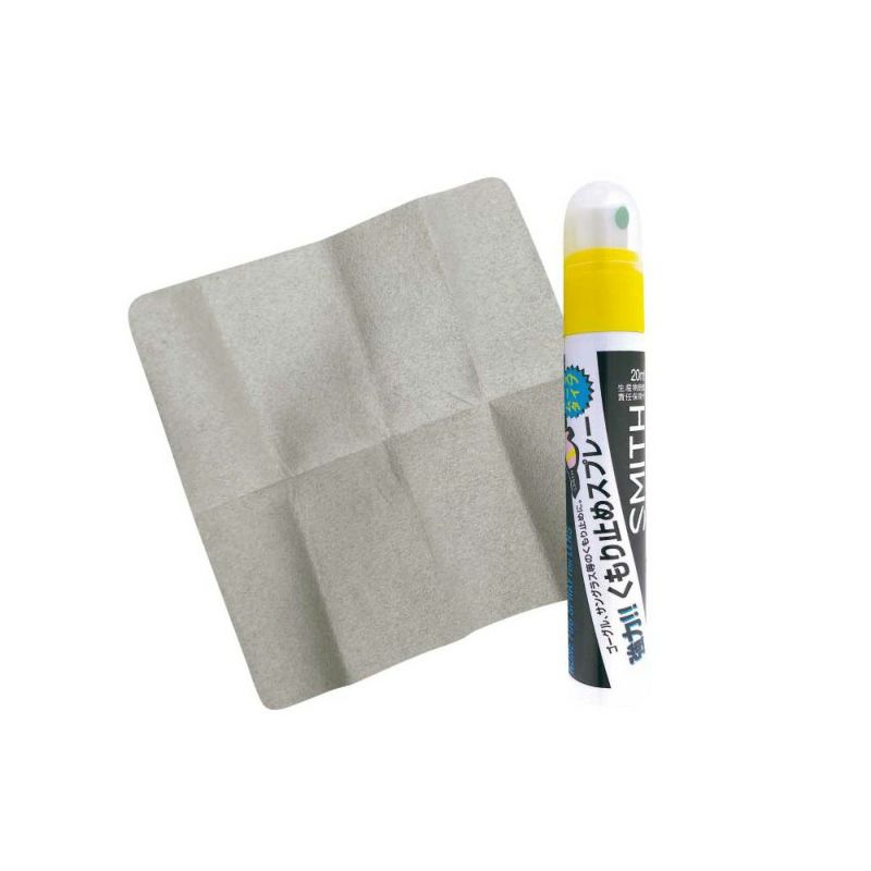 ムースタイプの曇り止めスプレー。付属の専用布を使おう。