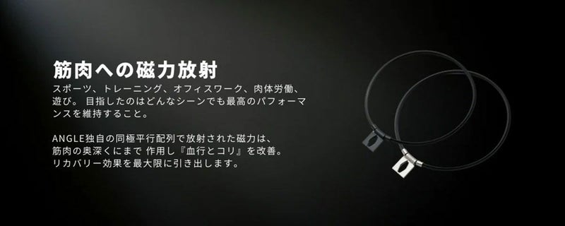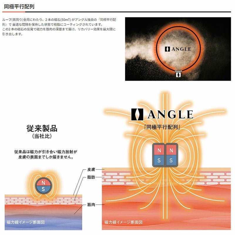 ループ全周にわたり、2 本の磁石(50mT) がアングル独自の『同極平行配列』で 最適な間隔を保持した状態で樹脂にコーティングされています。 この2 本の磁石の反発で磁力を筋肉の深層まで届け、リカバリー効果を最大限に引き出します。