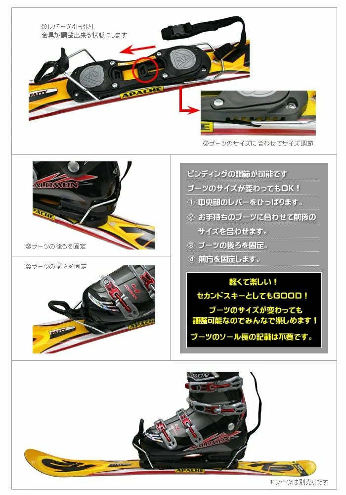 初めてショートスキー板を買いました。 サイズ調整もしやすく、ブーツの着脱もしやすかったです。 配送も早かったので、助かりました。