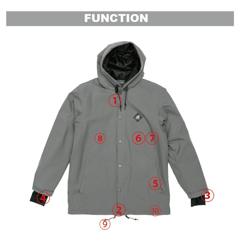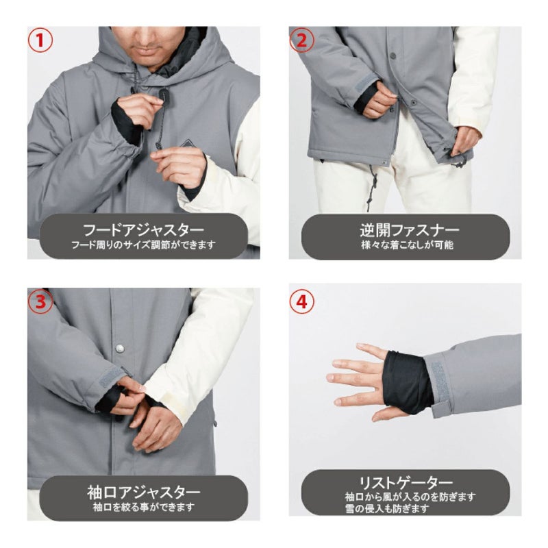 2種類のバックプリント、フーデッドジャケットスタイルはスノーボードだけではなくスキーヤーにも幅広く使っていただけるデザインとなっているジャケット。ストレッチ性を持つキャンバス素材を採用。素材は耐水10,000mm、透湿5,000g/m2/24hの高い機能を備えているので濡れにくく、中綿を入れることで防寒性がアップしていて暖かい!快適なライディングをサポートします!!