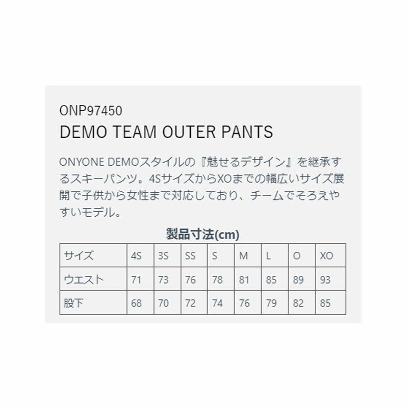 ONYONE DEMOスタイルの『魅せるデザイン』を継承するスキーパンツ。4SサイズからXOまでの幅広いサイズ展開で子供から女性まで対応しており、チームでそろえやすいモデル。