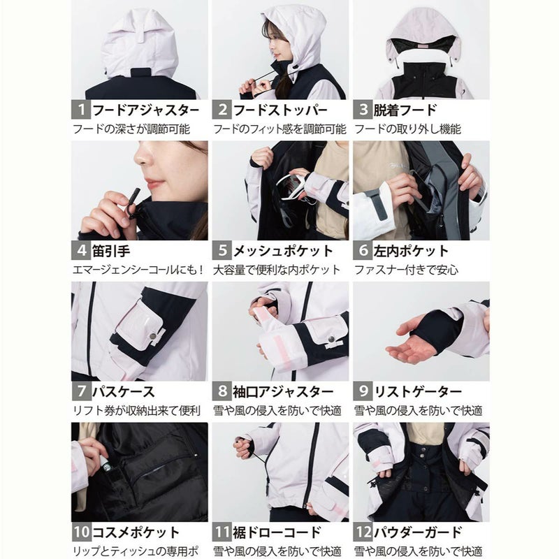 コスメポケット付きで女性向けの機能性も備えています。 中綿で保温性を提供しつつ、 透湿性も備わっているためウエア内をドライに保ちます。