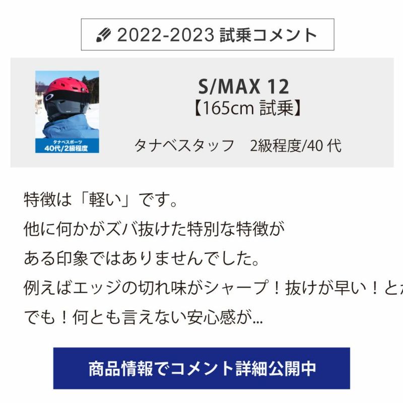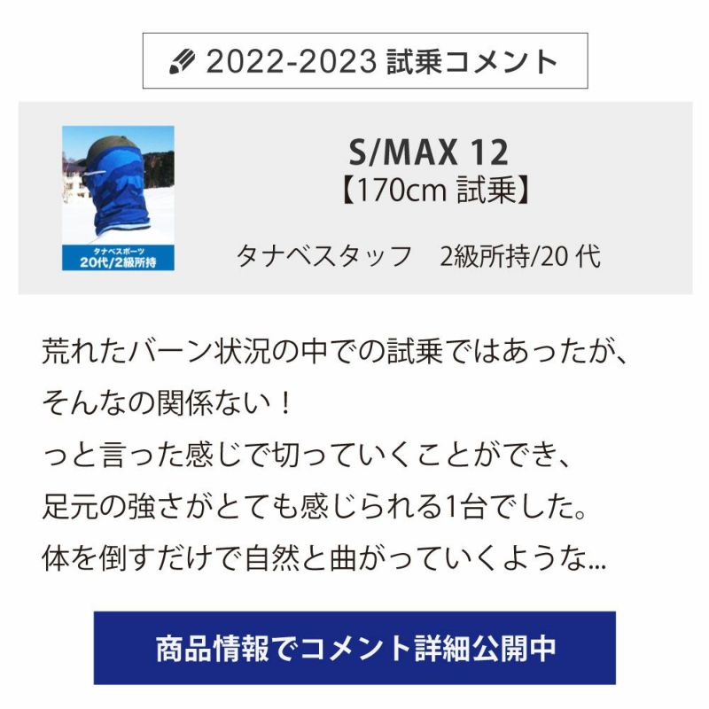 荒れたバーン状況の中での試乗ではあったが、そんなの関係ない!っと言った感じで切っていくことができ、足元の強さがとても感じられる1台でした。 体を倒すだけで自然と曲がっていくようなオートメーション感があるので、意外と脚力等は無くても体重移動だけで使いこなせれるのではと感じました。