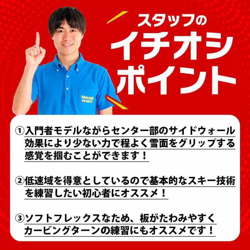 入門者モデルながらセンター部のサイドウォール効果で少ない力で程よく雪面をグリップき、低速でスキーを操作しやすく基本的なスキー技術をいち早く習得可能。