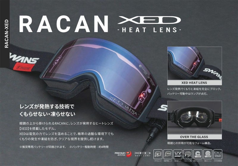 レンズに施された透明の発熱体。レンズのくもりや凍結を強制除去するゴーグルがRACANのフレームに搭載されたリニューアル。はつねつによるパワーは強力かつ効果的で湿気をレンズに寄せつけず、極寒の過酷な環境下でも凍結せずに極寒の環境でもクリアな視界を保つことができます。安全なライディングを徹底サポートするテクノロジーです。
