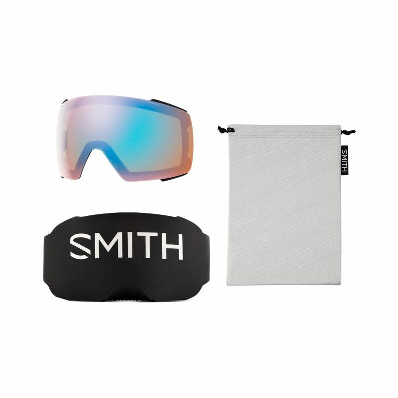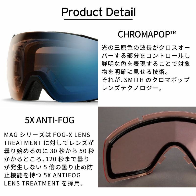 SMITH MAGTM レンズチェンジシステムを搭載したインターチェンジブルゴーグル。 独自のマグネットシステムとレンズセキュリティシステムを採用。 顔全体を包み込む完 璧なフィットを求めたミディアムサイズフレームを採用。 フォグフリービジョンを可能に するAir EvacTMM 機能でヘルメットとの究極なインテグレーション。最大限の視界を 確保するラージサイズの球面レンズには5XTM アンチフォグテクノロジーを装備。 一 切無駄のないコンパクトな構造がマグネットゴーグルとは思えない軽さを実現。 1枚で 全天候に対応できる史上最強のCP Pro Photochromic レンズをBlack に採用。 クロマポップレンズ2枚標準装備。 環境を考慮したサスティナブルパッケージにアップ デートされたため、gogglesocレンズプロテクターが付属する。