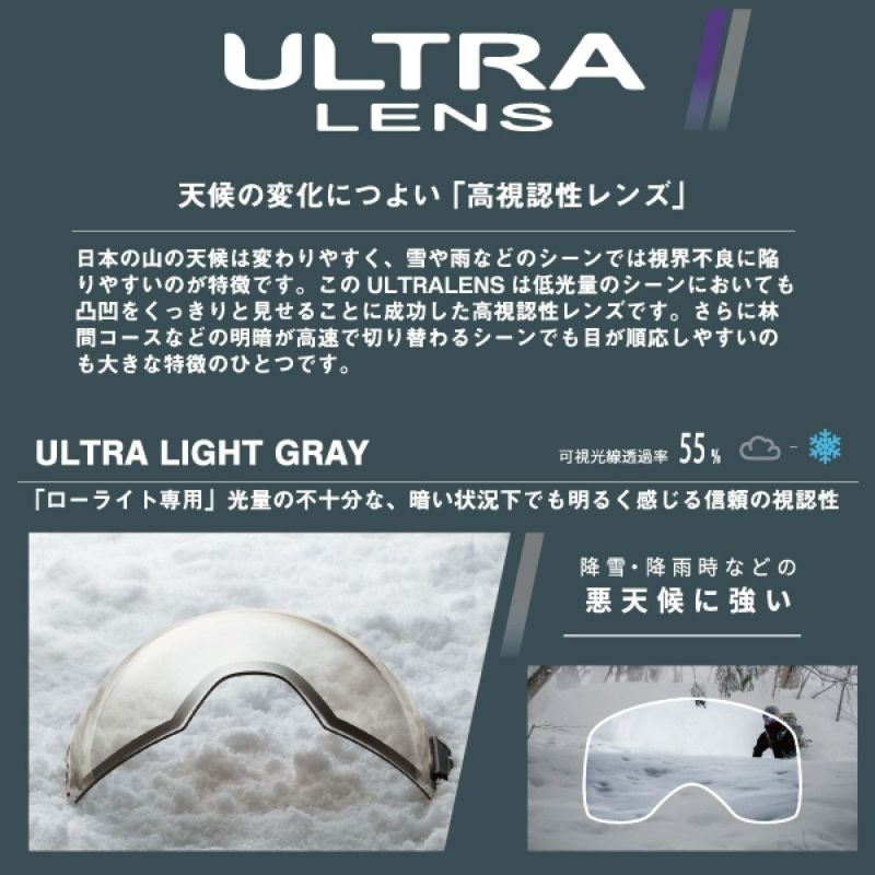 クリアのような、少しグレーの色味が入ったレンズ。光の少ない場所(降雪状態)や、日没、ナイターなど暗い場所での使用に特化しており、ナチュラルな視界を提供します。