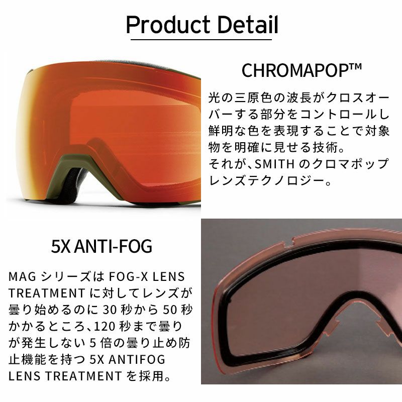 I/O MAGTM を可能な限り大きく進化させた I/O MAGTMM XL。 このサイズアップで 上下左右の視界がさらに広がり、要望の多かった眼鏡対応のフレームシステムを採用。 ラージフレームを覆うエクストララージサイズの球面レンズには世界最高峰のクロマポップレンズと5XTMMアンチフォグテクノロジーを採用。 このサイズで もヘルメットとのインテグレーションは絶妙でSMITH 独自のAirEvacTM 機能で フォグフリービジョンを可能にする。 レンズロックには独自のマグネットシステ ムとレンズセキュリティシステムを採用。 1枚で全天候に対応できる史上最強の CP Pro Photochromic レンズを多くのカラーに採用。クロマポップレンズ2枚標準装備。 ODS-3 対応。 環境を考慮したサスティナブル パッケージにアップデートされたため、 gogglesoc レンズプロテクターが付属する。