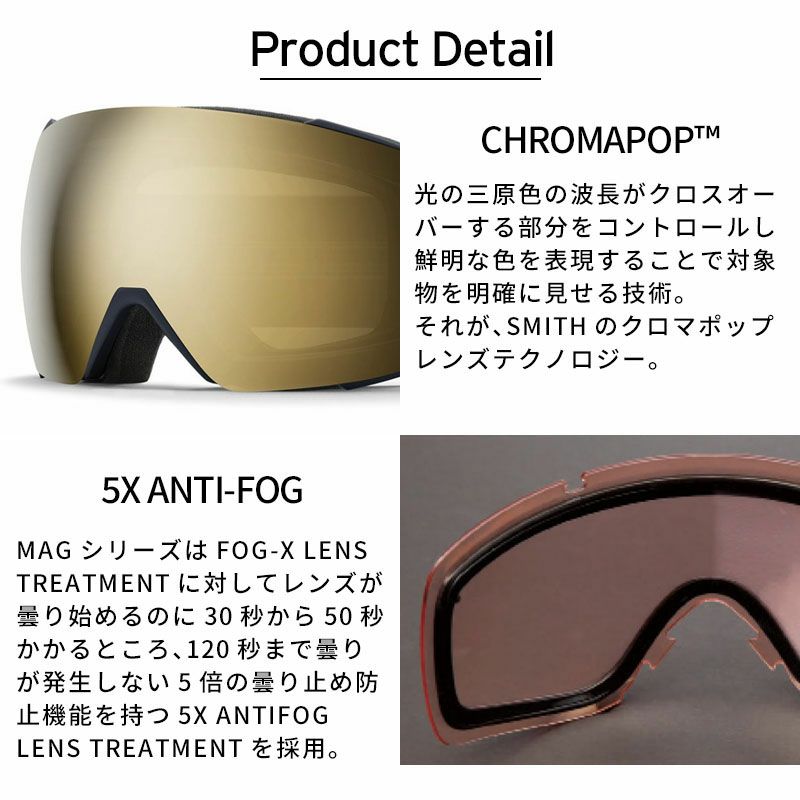 SMITH MAGTMM レンズチェンジシステムを搭載したインターチェンジブルゴーグル。 独自のマグネットシステムとレンズセキュリティシステムを採用。 顔全体を包み込む完璧なフィットを求めたミディアムサイズフレームを採用。 フォグフリービジョンを可能にするAir EvacTMM 機能でヘルメットとの究極なインテグレーション。 最大限の視界を 確保するラージサイズの球面レンズには5XTMM アンチフォグテクノロジーを装備。 一 切無駄のないコンパクトな構造がマグネットゴーグルとは思えない軽さを実現。 1枚で 全天候に対応できる史上最強のCP Pro Photochromic レンズを Black に採用。 クロマポップレンズ2枚標準装備。 環境を考慮したサスティナブルパッケージにアップ デートされたため、 gogglesoc レンズプロテクターが付属する。