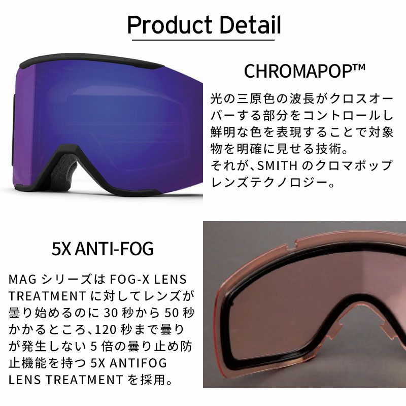 SMITH のアイコンモデルとも言えるSquad にMAGレンズチェンジステムを搭載させたSquad MAG。 MAGレンズチェンジシステムを搭載したロッキングシステムはフレームと一体化しているアウトリガーに配置させレンズを確実に固定する。 左右のロックを押すだけで簡単にレンズを外せるため天候やコンディションの変化に応じて瞬時にレンズを交換できる。 平面レンズ初の5XTM アンチフォグテクノロジーを搭載した最強モデルで雪山と遊んでほしい。 1枚で全天候に対応できる史上最強のCP Pro Photochromic レンズを多くのカラーに採用。 クロマポップレンズ2枚標準装備。 環境を考慮したサスティナブルパッケージにアップデートされたため、 gogglesoc レンズプロテクターが付属する。