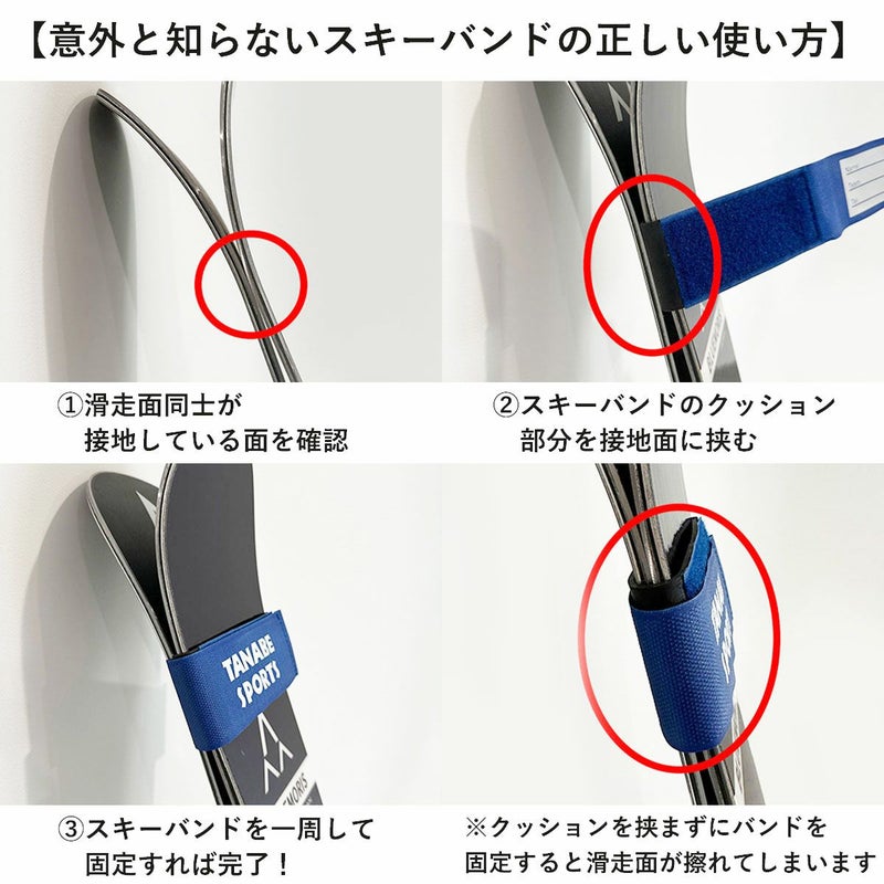 スキー板を買った時に付いてくるバンドと比べ、太さが太くクッション部分がスポンジではなくゴムになっています。かなりしっかりした作り、おすすめです