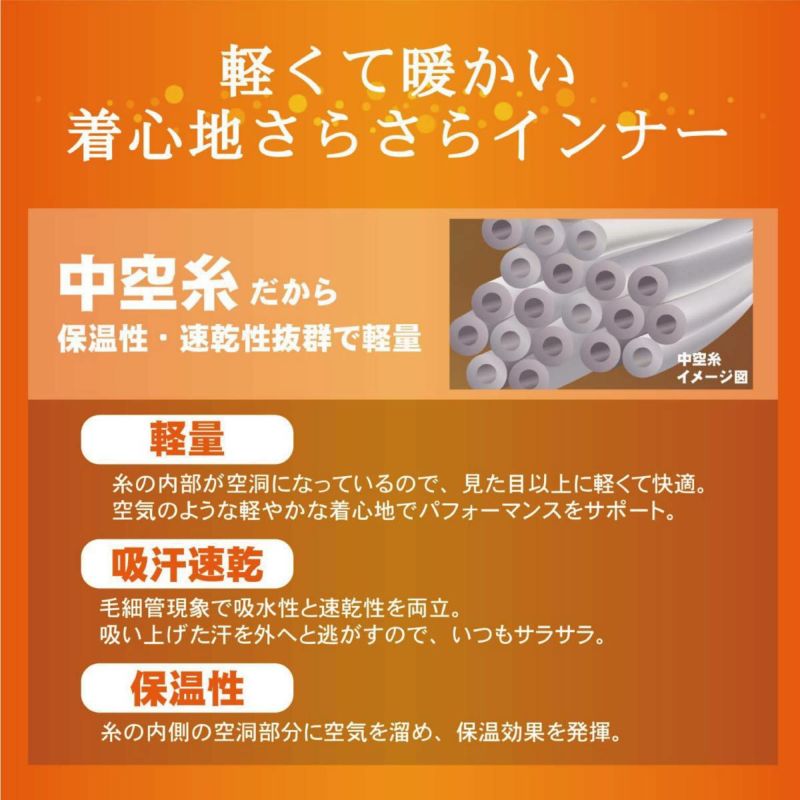 ・軽量で柔軟性に優れ、保温性・吸水性・速乾性が高い特徴を持つ中空糸使用。