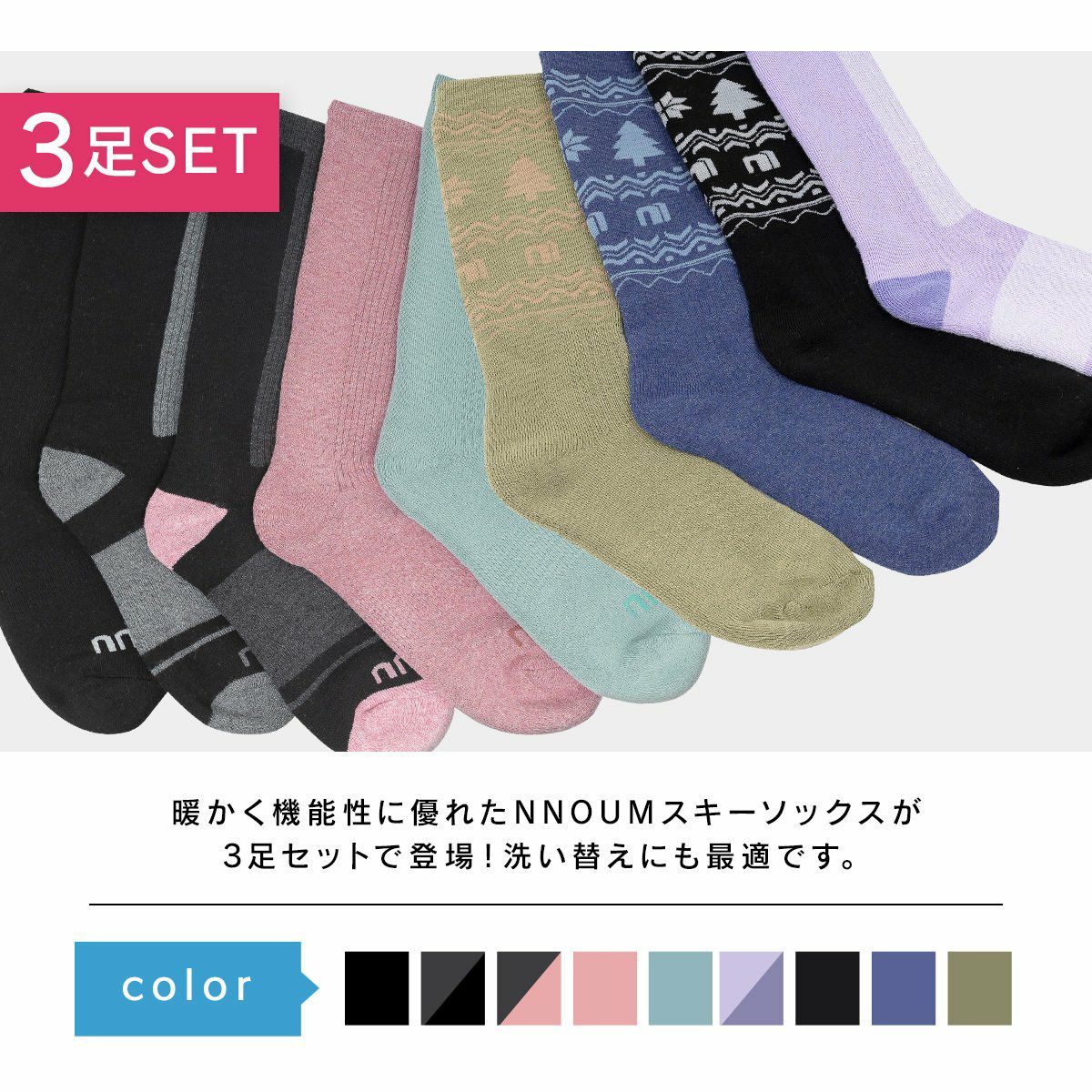 スキー スノーボート ソックス レディース 3足組 靴下 防寒 NNOUM ノアム 22-24 クッション性 おしゃれ かわいい 選べるカラバリ ハイソックス