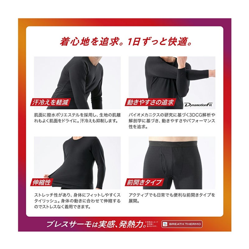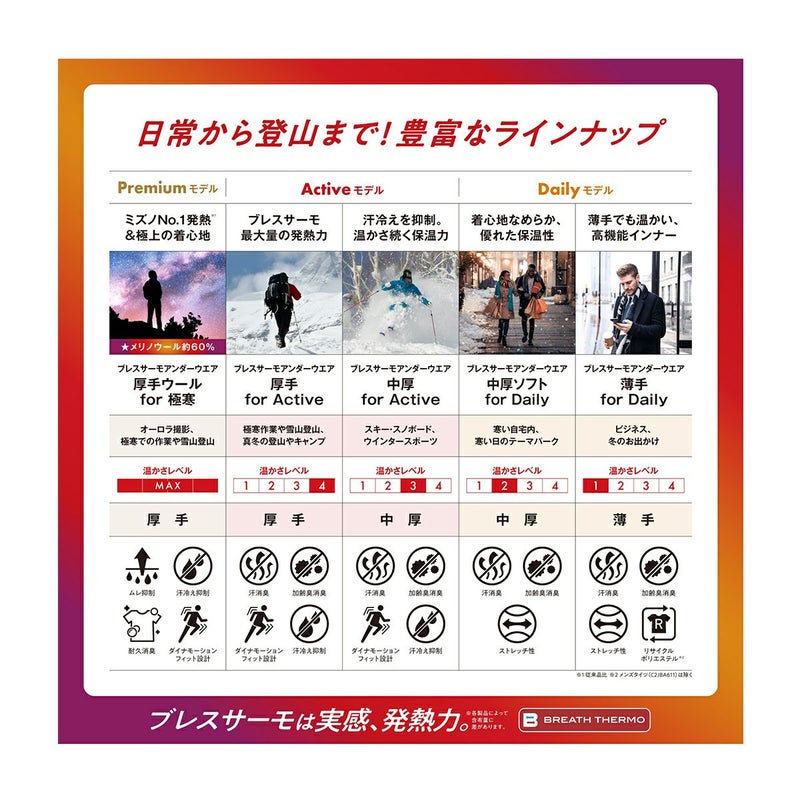 ■BREATH THEROMO:体からの水分を吸収、その吸着熱を利用して温度を上昇させる発熱素材。