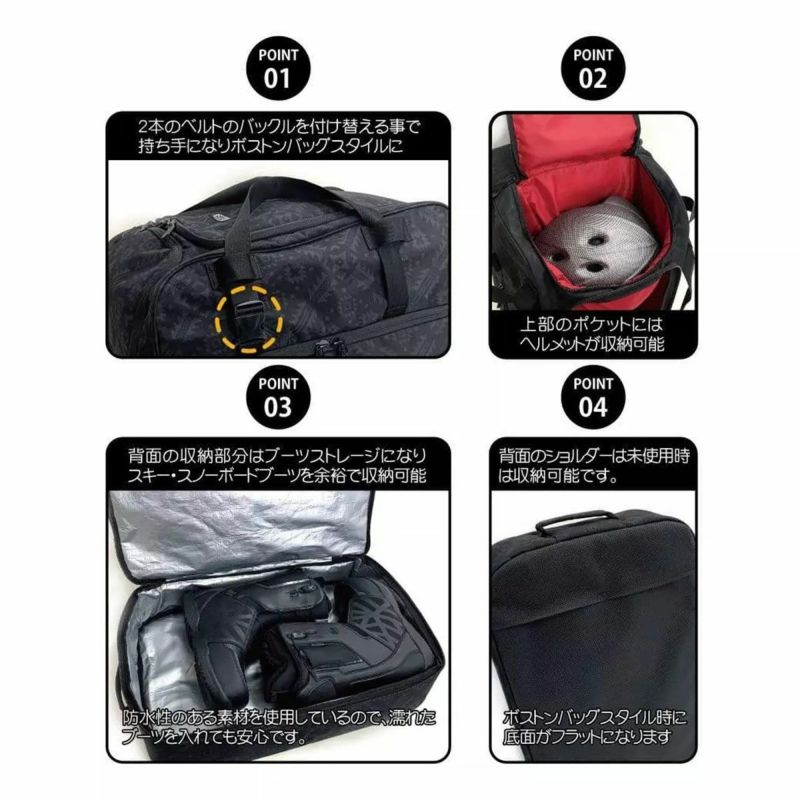 ●ショルダーを収納しバックルの取付け位置を変える事でボストンバッグとしても利用可能。