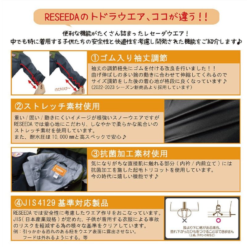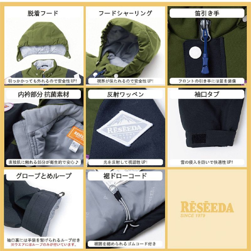RESEEDAでは、子供たちがより安全に雪遊びやウィンタースポーツを楽しめるよう、紐をウエアの表面に露出させない。フードはひっかかっても簡単に取れるようにするなど、安全性に考慮したウエアの開発に努めています。