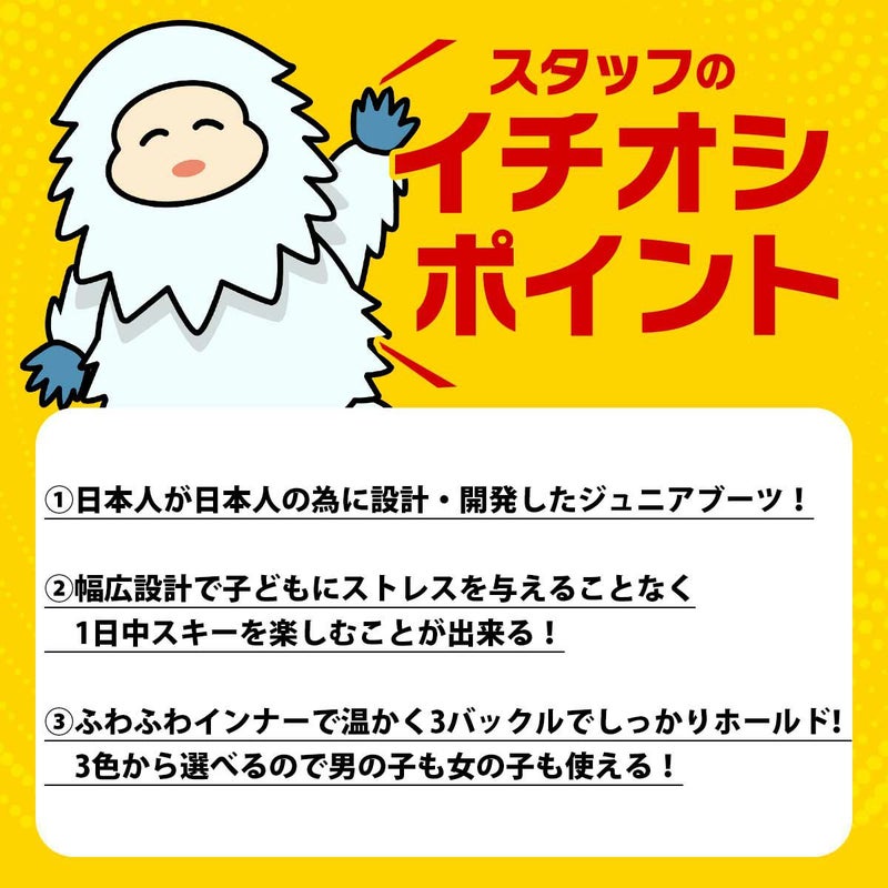 ソフトフレックスによる自然なエクササイズからスタート!初めてのスキーから楽しくレベルアップまで対応! 滑る楽しさを体感できるジュニア・キッズ専用のバックルブーツ!